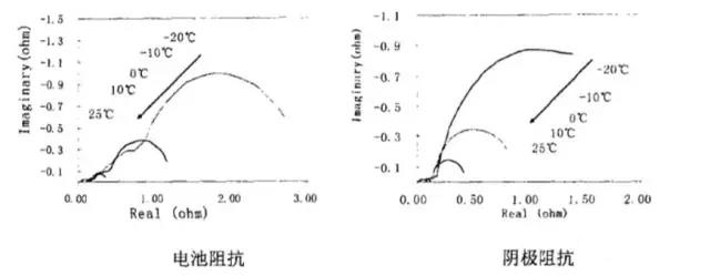 電池阻抗主要體現(xiàn)為電化學(xué)反應(yīng)阻抗,而歐姆阻抗相對較小。由下圖可知。隨著溫度的下降,電池阻抗逐漸上升,且下降至0°C以后,阻抗速度增大,陰極阻抗呈類似的趨勢,從數(shù)值上來看,電池的阻抗主要來源于陰極阻抗的貢獻。