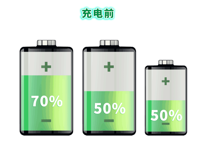 對于第一種情況,SOC一致,容量不一致。就好像一個碗的邊緣有了缺口,原本能裝50ml水,但現在只能裝40ml,否則就會從缺口漏出來。此時,容量小的最先充滿和放空,是整個電池包容量的瓶頸。我們想象一下,在充電前,三節容量不同的電芯他們的SOC是相同的,即當前電量都是滿電電量的一半。