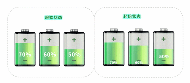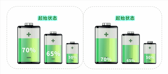 起始狀態:容量相同的三節電芯,SOC當前電量與滿電電量占比不一樣。可以發現,SOC最高的電芯最先充滿,SOC最低的電芯最先放空。而且此時只能停止充放電,以避免過充和過放行為發生。SOC最低的電芯是整個電池包容量的瓶頸。