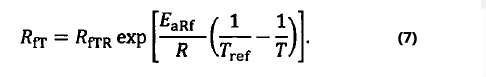 實(shí)驗(yàn)結(jié)果表明電池在循環(huán)過(guò)程中,A~D這4個(gè)位置在電池表面處的溫度隨時(shí)間變化,在該低溫循環(huán)條件下,4個(gè)位置的最大溫差在2℃以內(nèi)?R film是對(duì)溫度較為敏感的參數(shù),其隨溫度的變化通常可以利用阿累尼烏斯關(guān)系式來(lái)表述: