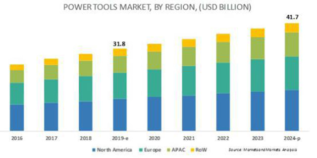 根據行業數據,2019年全球電動工具市場將達到318億美元(約2252億元人民幣)。根據復合年增長率,到2024年,全球電動工具市場將達到417億美元(約2953億元人民幣)。